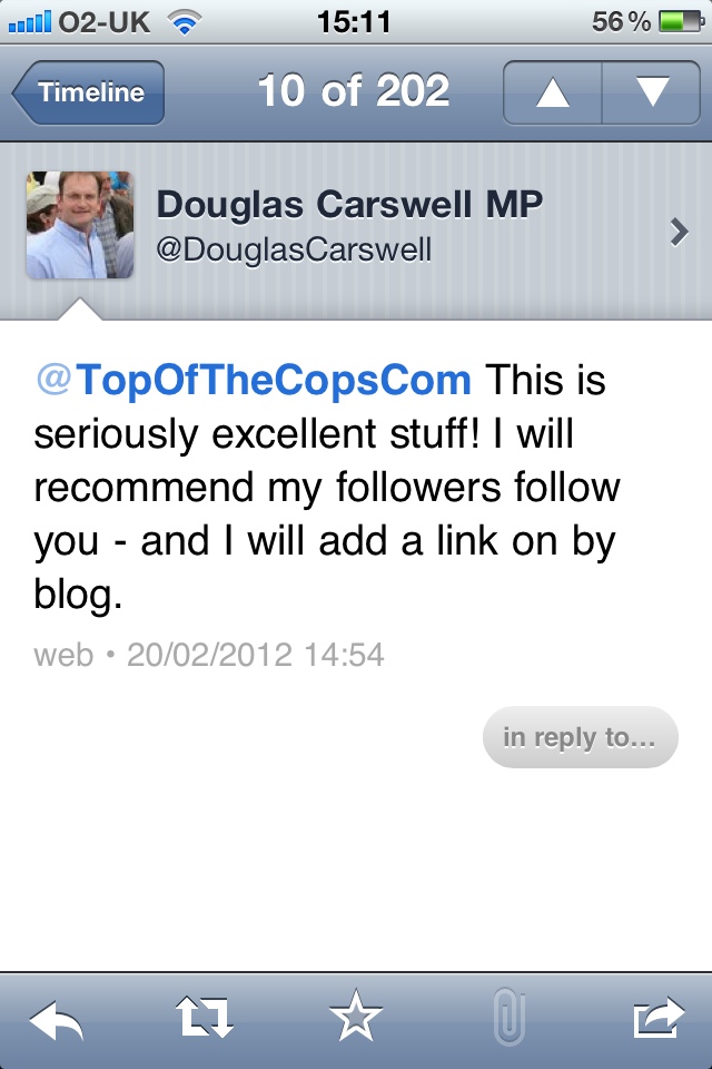 Thanks to Douglas Carswell MP, tireless defender of Parliamentary sovereignty and father of what has become the elected Police and Crime Commissioner for encouraging his 6,000+ Twitter followers to follow this site, and listing us on his roll of favourite blogs at TalkCarswell.com