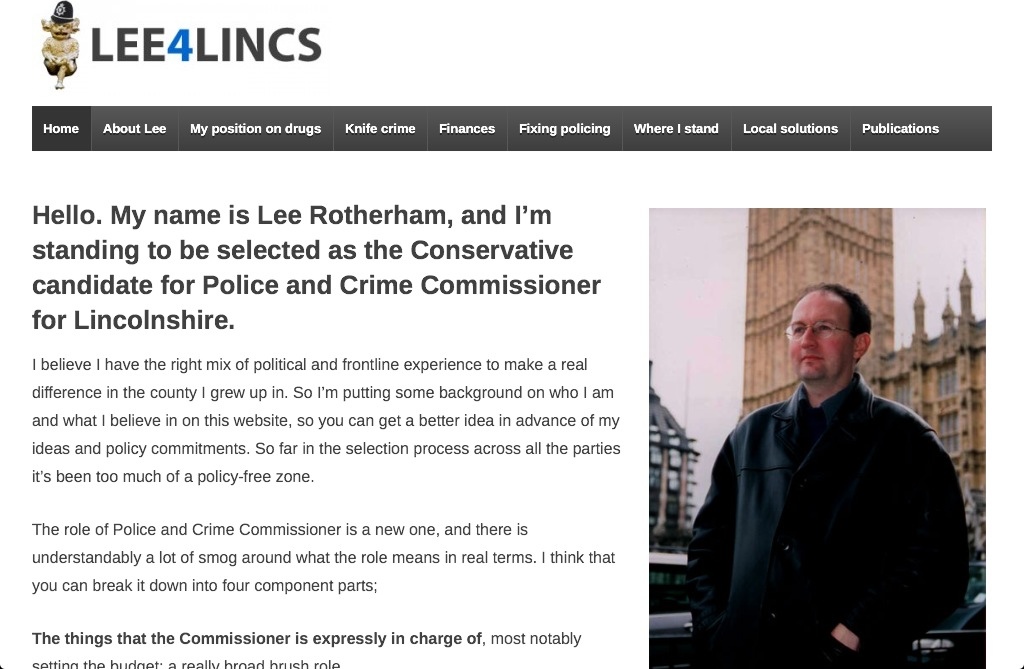 On the Conservative side, the Police Foundation reported that Angus Campbell, Leader of Dorset County Council, had confirmed he was seeking the Conservative nomination for PCC, and in Lincolnshire Lee Rotherham launched his very impressive website featured in the graphic above.