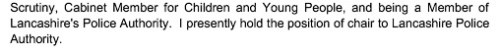 Hi Sam, thanks for pointing out the inaccuracy on my LCC website. The information on the website was typed in by Council Officers and it may have been a mistake at this point. It should have read: Chair of Resources on Lancashire Police Authority (now Planning & Resources). I could, of course, have made an error when providing the information – but I honestly can’t remember. I will ensure the error is rectified.