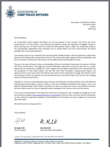 Together with the Association of Police Authorities, they are having a big conference in Manchester from 22-24 May called ‘Leading Change in Policing’ and, on the middle day, are opening it up to outsiders in the form of prospective PCCs. It will be a bit like when the local Freemasons let people come in and have a peek at their halls. Possibly with many of the same faces, come to think of it…
