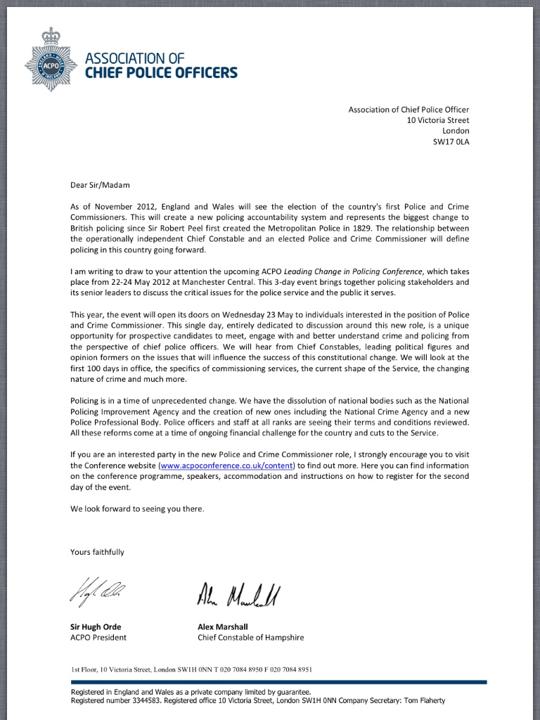 When I heard this I again waited the appropriate amount of time, but panelist invitation came there none. Apparently ACPO don’t want to mess with any implied backing involved in selecting the candidates, so have asked the political parties to do it for them, and for Independents have approached the LGA (grrr!).