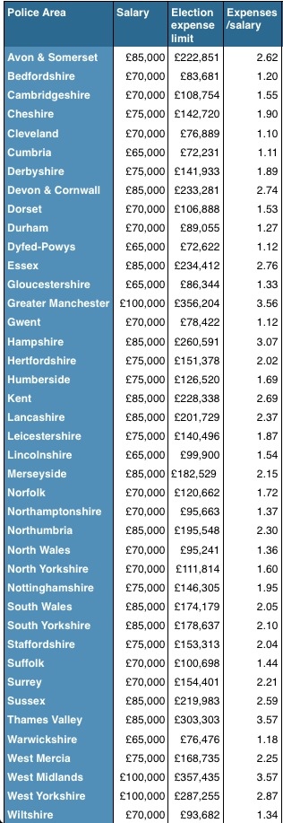 And below you will also find the limit for election expenses for each candidate in each police area for the period immediately preceeding the election. This is mostly related to the number of electors in each area.